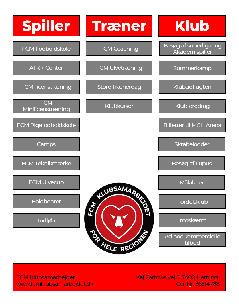 FCM Klubsamarbejdet byder på en lang række aktiviteter for spillere - trænere - klub. Noget som man alt sammen kan læse mere om på sitet her. Nedenfor ses mulighederne i en samlet oversigt...